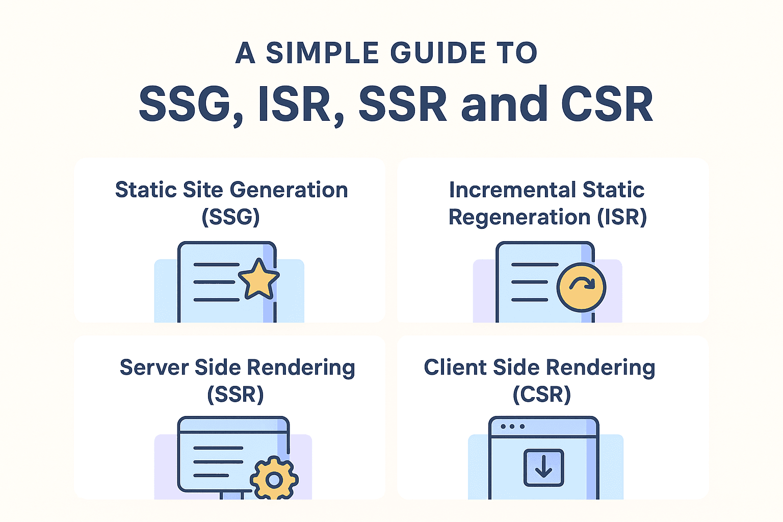 Over time, new techniques were introduced to make websites faster, more scalable and more user friendly. These techniques changed how pages are created and delivered. Four of the most common approaches today are SSG, ISR, SSR and CSR. Let’s look at each one in simple words.